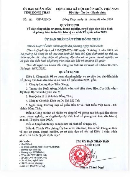 Ngày 28/01/2026, theo Quyết định số 283/QĐ-UBND của Ủy ban nhân dân tỉnh Đồng Tháp, Công ty Lương thực Tiền Giang vinh dự là một trong những đơn vị được công nhận điển hình trong phong trào “Toàn dân bảo vệ an ninh Tổ quốc” năm 2025. Đây là sự ghi nhận quan trọng của các cấp ngành trong tỉnh Đồng Tháp đối với những nỗ lực, tinh thần trách nhiệm và sự phối hợp chặt chẽ của Công ty Tigifood trong công tác bảo đảm an ninh trật tự, xây dựng môi trường sản xuất – kinh doanh an toàn, ổn định và phát triển bền vững. Trong thời gian qua, Công ty Tigifood luôn xác định công tác bảo vệ an ninh Tổ quốc là nhiệm vụ trọng tâm, thường xuyên, Công ty luôn chủ động triển khai các giải pháp phòng ngừa, nâng cao ý thức chấp hành Pháp luật tới toàn thể cán bộ, người lao động, phối hợp hiệu quả với lực lượng chức năng tại địa phương nơi các đơn vị trực thuộc đóng tại địa bàn góp phần giữ vững an ninh chính trị, trật tự an toàn xã hội. Danh hiệu này là niềm tự hào của tập thể cán bộ, công nhân viên người lao động của Công ty, đồng thời là động lực để tiếp tục phát huy tinh thần đoàn kết, trách nhiệm và kỷ cương, đóng góp tích cực vào sự phát triển Kinh tế – Xã hội - An ninh - Quốc phòng của địa phương. Ban Lãnh đạo Công ty LT Tiền Giang xin Trân trọng cảm ơn sự quan tâm, chỉ đạo của các cấp Lãnh đạo tỉnh Đồng Tháp cùng với sự đồng hành của toàn thể cán bộ, người lao động trong suốt thời gian qua. Công ty cam kết tiếp tục đồng hành cùng địa phương vì một môi trường an toàn và thịnh vượng.