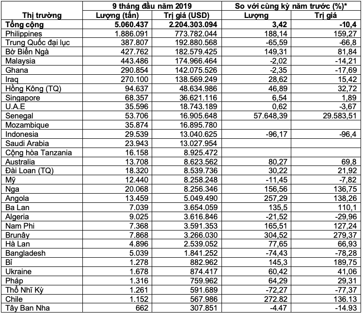 Gạo của Việt Nam xuất khẩu nhiều nhất sang thị trường Philippines, đạt 1,89 triệu tấn, tương đương 773,78 triệu USD, tăng mạnh 188% về lượng và tăng 159,3% về kim ngạch so với cùng kỳ năm 2018, chiếm 37,3% trong tổng lượng gạo xuất khẩu của cả nước và chiếm 35,1% trong tổng kim ngạch. Giá xuất khẩu sang thị trường này giảm 10% so với cùng kỳ, đạt 410,3 USD/tấn.